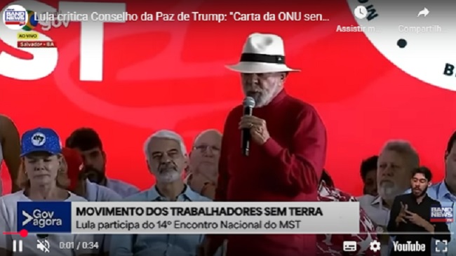 “A carta da ONU está sendo rasgada e, ao invés, da gente corrigir a ONU, que a gente reivindica desde que fui presidente em 2003, uma reforma com a entrada de novos países, com a entrada de México, do Brasil e de países africanos, o que está acontecendo? O presidente Trump está fazendo uma proposta de criar uma nova ONU em que ele, sozinho, é o dono da ONU”, disse Lula durante cerimônia do 14º Encontro Nacional do Movimento dos Trabalhadores Rurais Sem Terra (MST), em Salvador (BA).